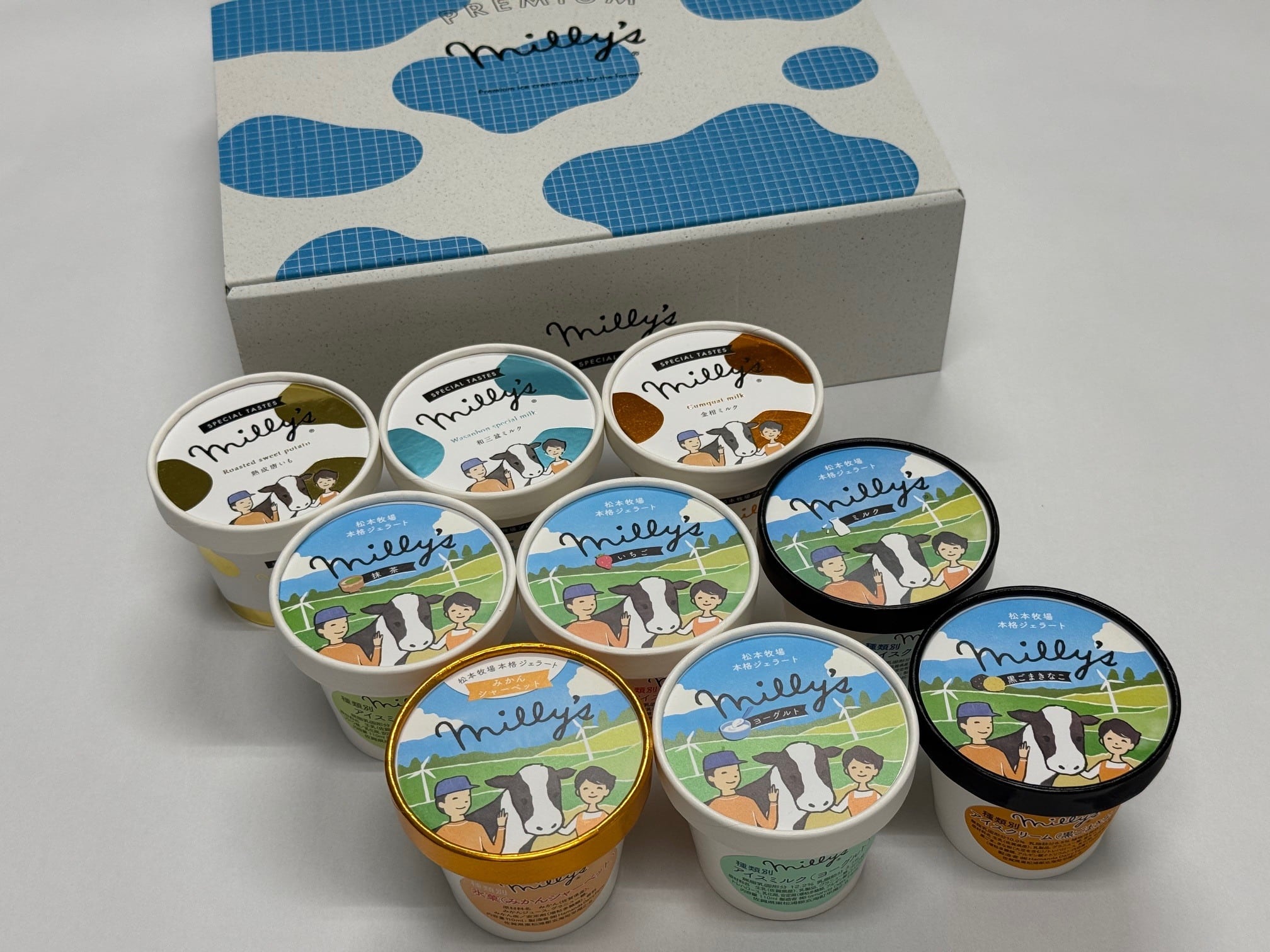 定番ミリーズに加え、厳選された素材のみを使用したプレミアムなアイスを専用のボックスに詰め合わせた9個入りセット。ギフトにもおすすめです。
